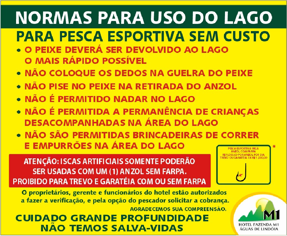 A fim de garantir a conservação do nosso nosso Lago de Pesca e proporcionar uma experiência agradável e segura para todos, solicitamos a sua colaboração no cumprimento das seguintes normas de utilização do lago de pesca esportiva: