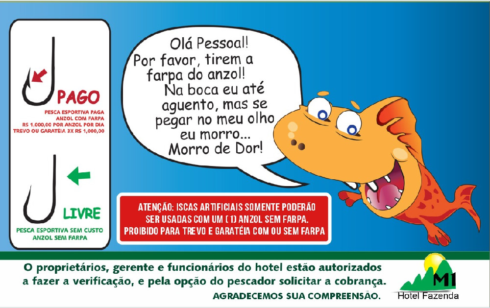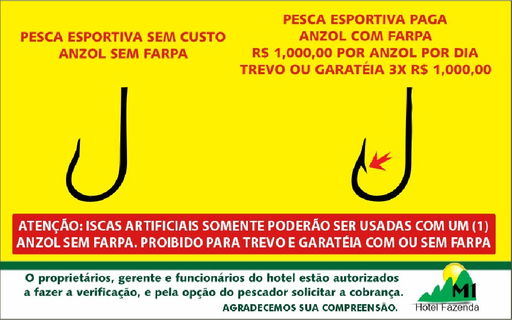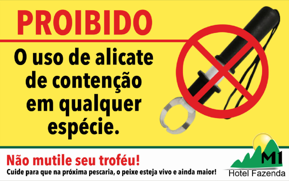 - Equipamento Não Permitido: Anzol com farpa ou fisga, garatéia, palito, linha de multifilamento, cabo de aço e alicate de contenção (pode ferir ou matar o peixe);