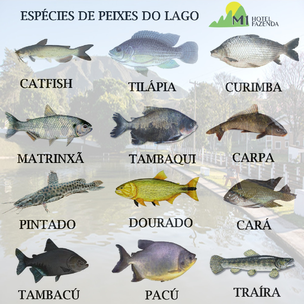 Tambacu, Pacu, Matrinxã, Patinga, Surubim Pintado, Pincachara, Jundiá (Pintado Real), Catfish, Curimba, Tilapia, Dourado, Traíra, Carpa Capim, Carpa Húngara, Carpa Koi (colorida) e Carpa Cabeçuda.